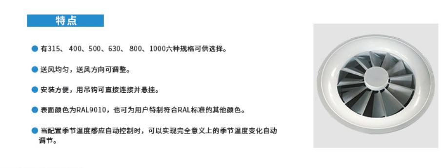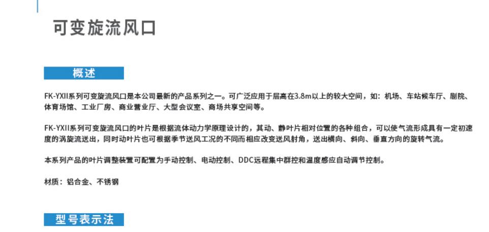 旋流风口可广泛应用于层高在3.8m以上的较大空间,如:机场、车站候车厅、剧院、体育场馆、工业厂房、商业营业厅、大型会议室、商场共享空间等。 可变旋流风口的叶片是根据流体动力学原理设计的,其动、静叶片相对位置的各种组合,可以使气流形成具有一定初速度的涡旋流送出,同时动叶片也可根据季节送风工况的不同而相应改变送风射角,送出横向、斜向、番直方向的旋转气流。 本系列产品的叶片调整装置可配置为手动控制、电动控制、DDC远程集中群控和温度感应自动调节控制。