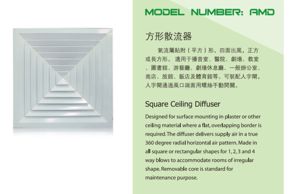 方形散流器是一种普通送风口产品,可广泛应用于宾馆、剧场、候机(车)大厅、图书馆等对空气品质及噪声要求较高,但建筑室内层高小于 5 米的场所。散流器送风气流常为贴附着室内平顶向四周扩散的流 动状,具有气流诱导性能好、扩散快速且均匀、噪声低等特点;多应用于上送下回的气流组织系统中。按照气流扩散的形式本系列产品可以分成 10 多种,可以形成 1-4 个不同的送风方向,可与对开多叶调节 阀或单开阀板式风量调节阀配套使用,具体结构简单,拆装方便等优点。