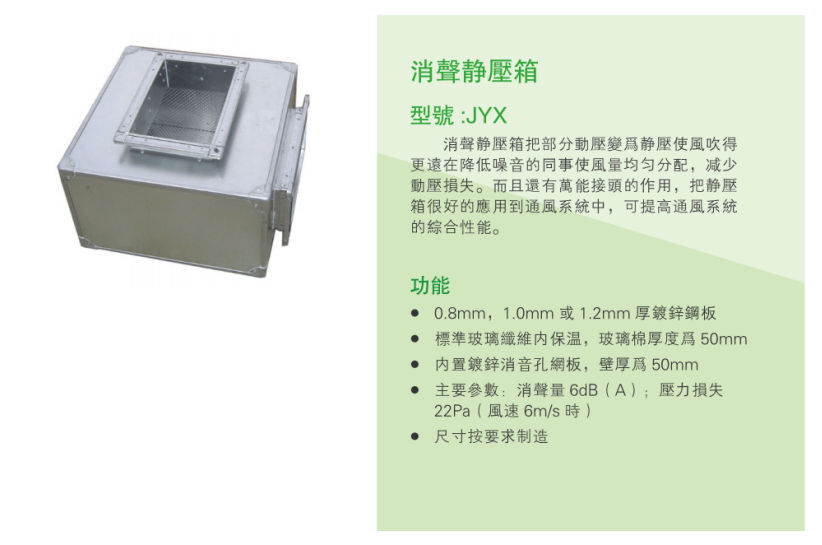 静压箱 静压箱 消聲静壓箱把部分動壓變爲静壓使風吹得更遠在降低噪音的同時使風量均匀分配,减少動壓损失。而且還有萬能接頭的作用,把静壓箱很好的應用到通風系统中,可提高通系统的综合性能。 产品介绍 上一个:单风箱 下一个:双风箱
