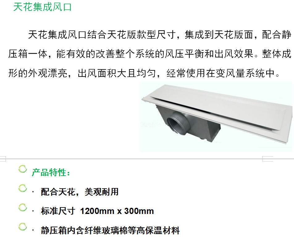 天花集成风口 天花集成风口 天花集成风口结合天花板款型尺寸,集成到天花板面,配合静压箱一体,能有效的改善整个系统的风压平衡和出风效果。整体成形的外观漂亮,出风面积大且均匀,经常使用在变风量系统中。 产品介绍 上一个:线槽型散流器 下一个:灯盘静压送风箱